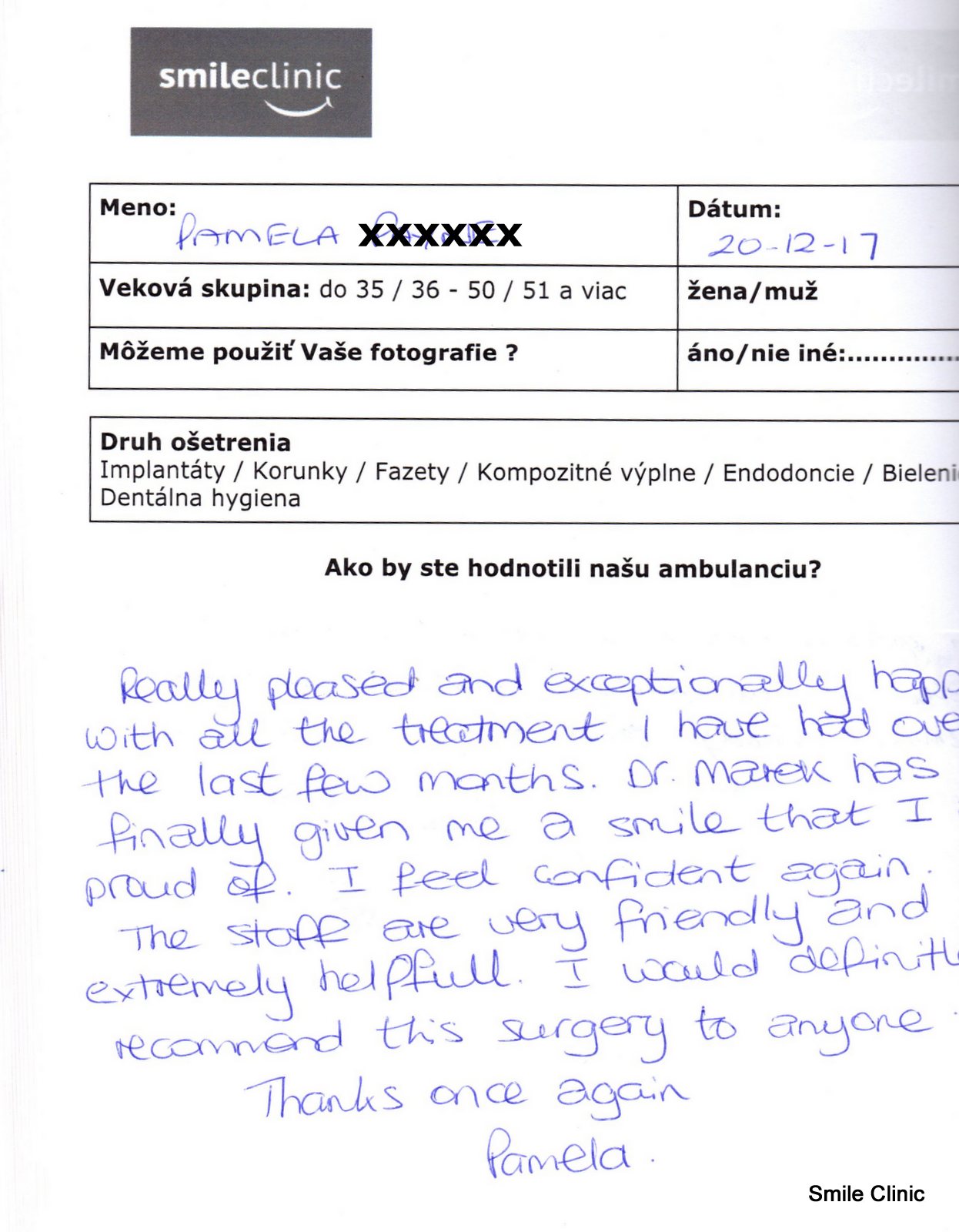On her final visit, we fitted the final implant crowns and 9 zirconium crowns. Pamela left our clinic with a wide smile, and she left us this pleasant testimonial:
