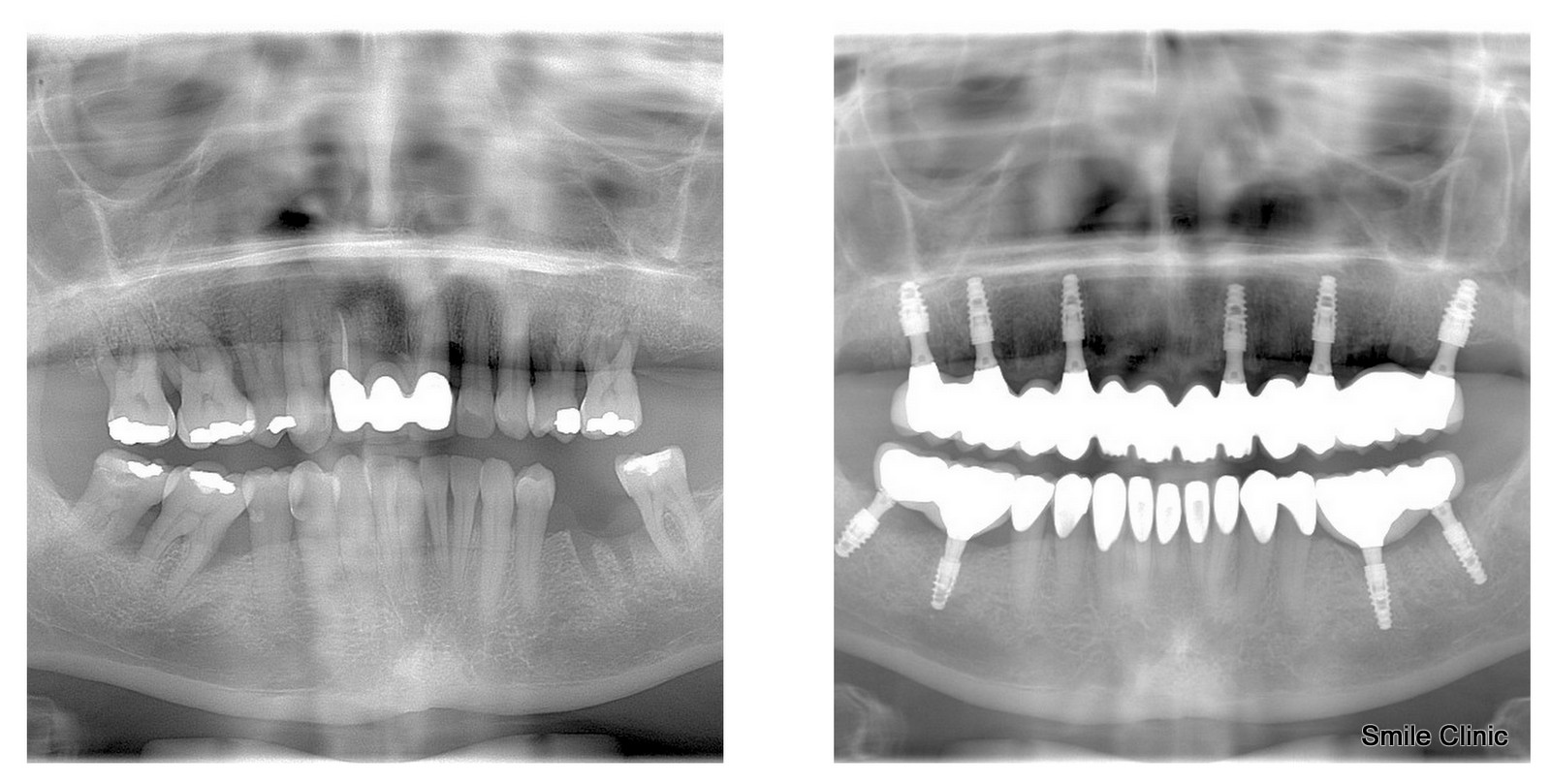 Mrs Pamela from Manchester, UK, contacted us 2 months after her 50th birthday, and her wish was to have all her teeth replaced with dental implants and dental crowns. She made a booking at our dental clinic for a consultation, during which we took X-rays and a CT scan. The doctor, Dr Marek, recommended the All-on-6 treatment for her upper jaw. He suggested leaving her lower front teeth as they were in good condition and placing only 2 implants on the lower left and 2 on the lower right. After the consultation, Pamela decided to return to the UK and took her time to make the decision.