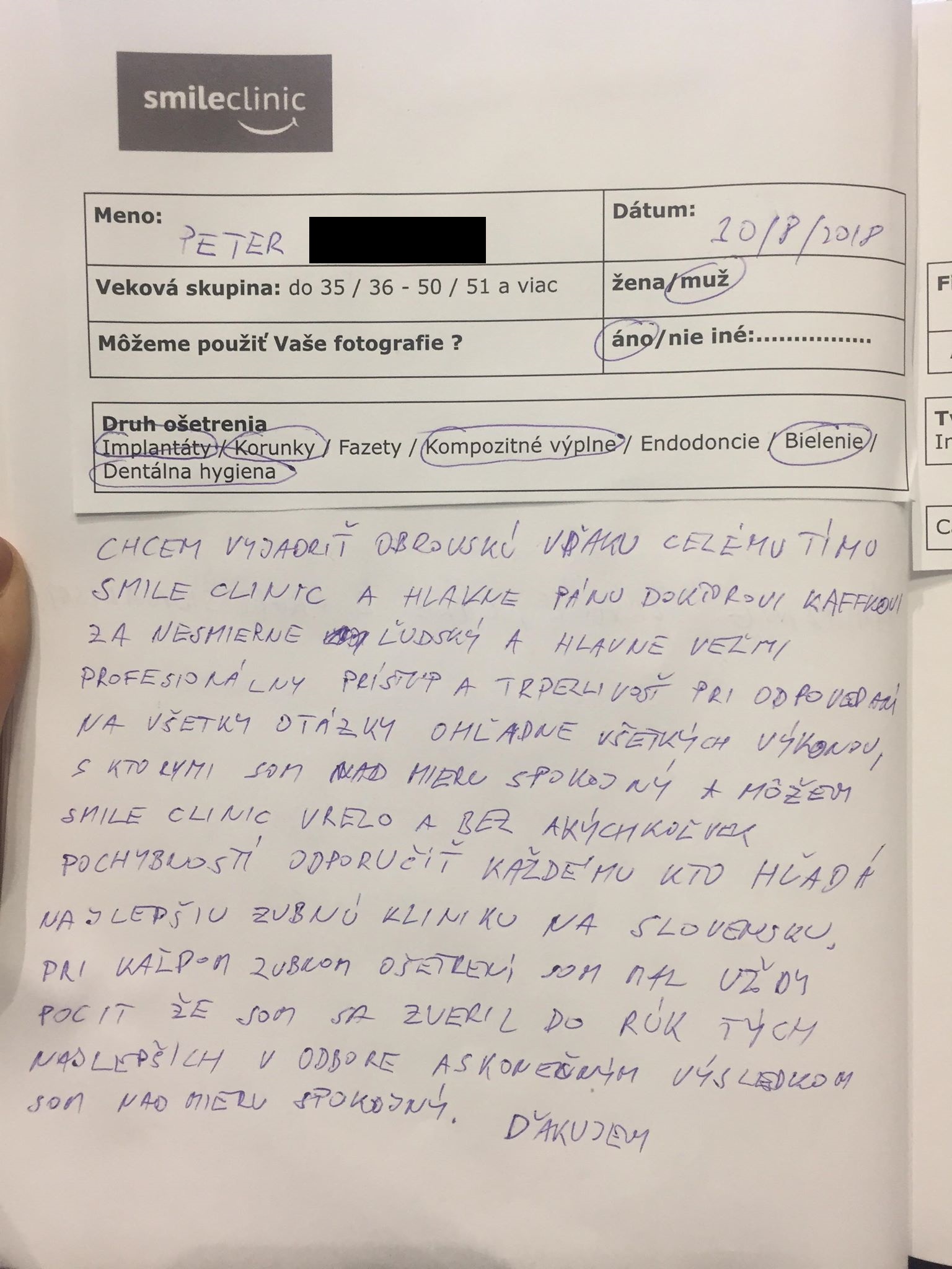 I want to give a big Thank you to whole Smile Clinic team and especially to Dr. Kafka for very friendly and very professional attitude. Also for patience with all the questions. I am more than satisfied with all treatment I got and I could reformed Smile Clinic without any doubts to everyone who seek the best dental clinic in Slovakia. During every treatment I had the feeling that I put myself to the hands of the most professional doctors I ever could. With the final result I am more than satisfied. Thank you