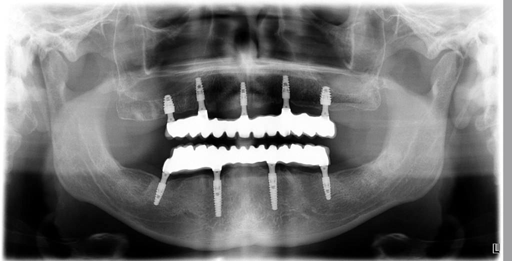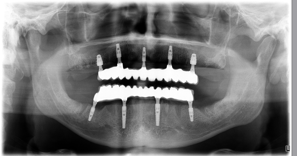 5 implantátov v hornej čeľusti a 4 implantátov v dolnej čeľusti, ktoré nesú 12 korunkových zubov ( teda mostík ) hore a 12 dole.